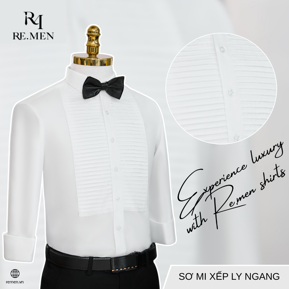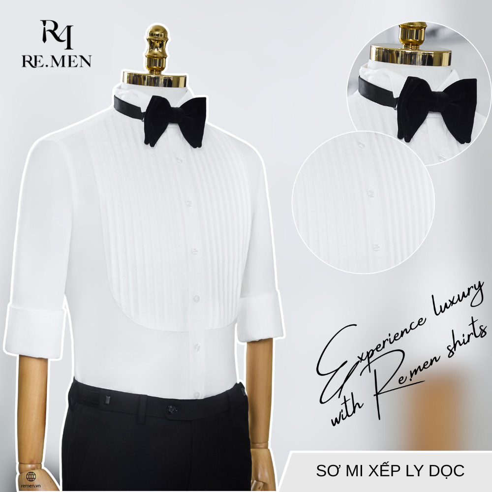 4) Sơ mi xếp ly ngang: Tăng độ đầy đặn, đặc biệt hợp với tuxedo & nơ