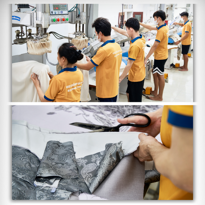 Sau đó, quá trình chọn vải bắt đầu. Từ những chất liệu cao cấp như wool pha cotton hay vải xương cá, khách được tư vấn kỹ về độ rơi, độ thoáng và cách vải phản sáng. Từng mảnh vải được cắt, ghép, canh theo dáng người thật, không chỉ dựa trên số đo.