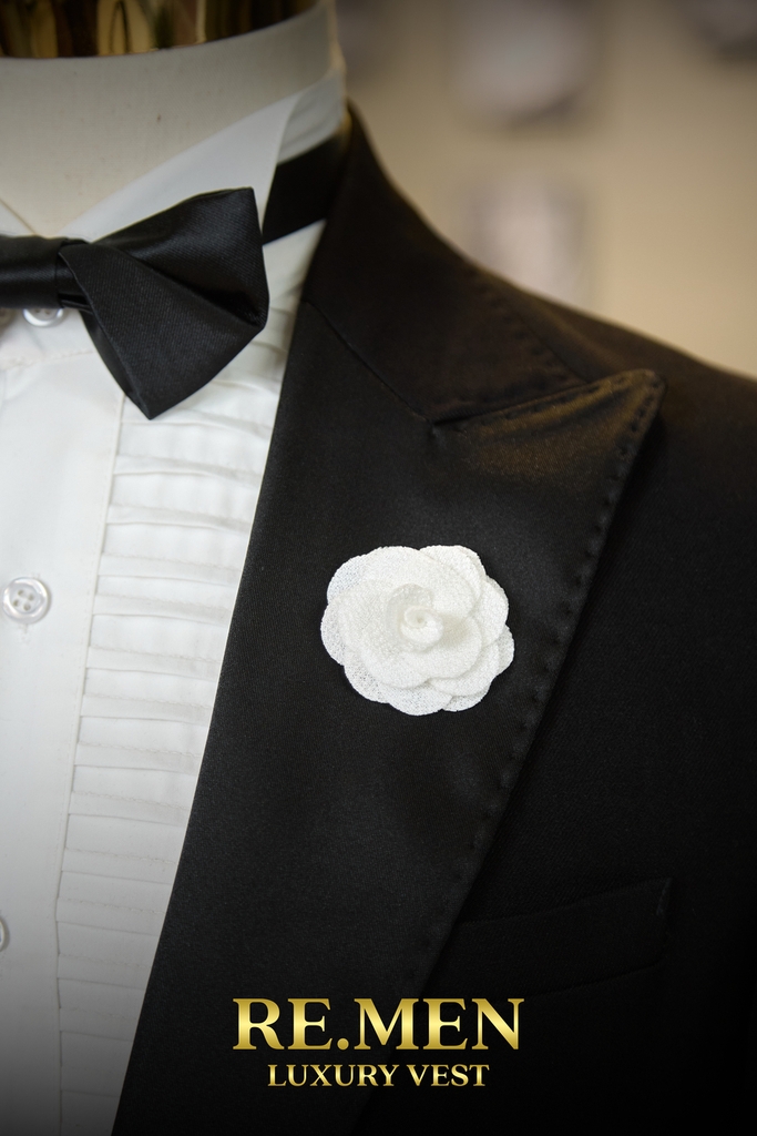 Chiếc ghim hoa trắng không quá nổi bật, nhưng lại làm tăng chiều sâu cho trang phục. Phù hợp với những quý ông yêu sự tinh gọn, có phong cách riêng, không phô trương nhưng đủ sức tạo dấu ấn.
